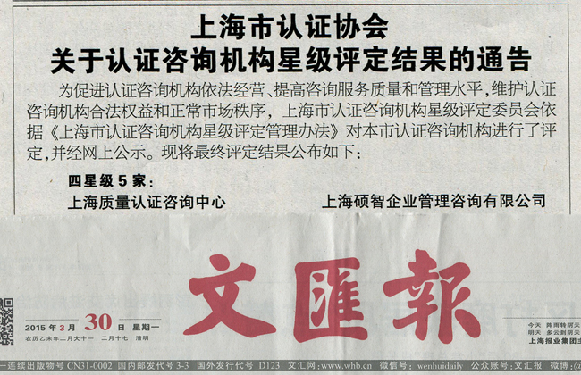 近日,認證咨詢機構(gòu)星級評定結(jié)果在上海市認證協(xié)會官方網(wǎng)站、文匯報等媒體上揭曉,其中5家機構(gòu)被評為四星級、10家機構(gòu)被評為三星級機構(gòu)。我司以總分第二名榮獲四星級認證咨詢機構(gòu)。3月30日下午,我司董事長黃文平博士參加了本次頒獎儀式。
