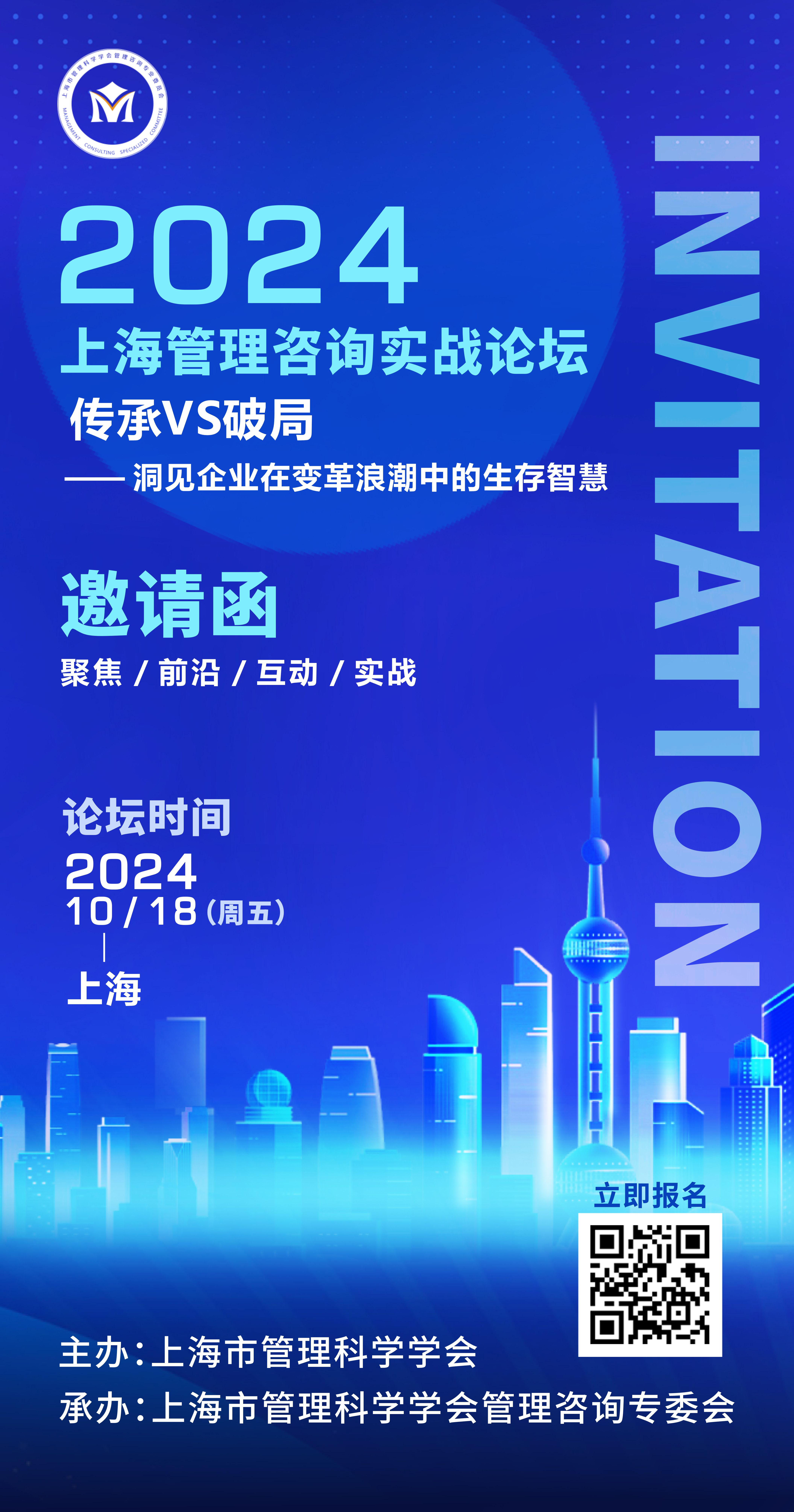 “2024上海管理咨詢實(shí)戰(zhàn)論壇”將于10月18日在上海隆重舉辦,本次論壇由上海市管理科學(xué)學(xué)會(huì)管理咨詢專業(yè)委員會(huì)主辦,由碩智咨詢、塞氏中國(guó)研究院、百川會(huì)計(jì)師事務(wù)所、棋盤資本、宋和顧律師事務(wù)所等單位聯(lián)合承辦,參會(huì)人員規(guī)模預(yù)計(jì)250人。