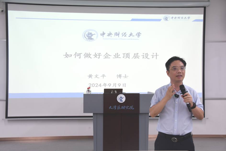 2024年9月9日,公司創(chuàng)始人、企業(yè)頂層設(shè)計專家黃文平博士應(yīng)邀為中央財經(jīng)大學(xué)2023級碩士生授課,本次學(xué)員對象為產(chǎn)教融合項目金融及會計兩個專業(yè)的近200名碩士生,授課主題為"如何做好企業(yè)頂層設(shè)計——企業(yè)經(jīng)營管理者的一堂必修課"。