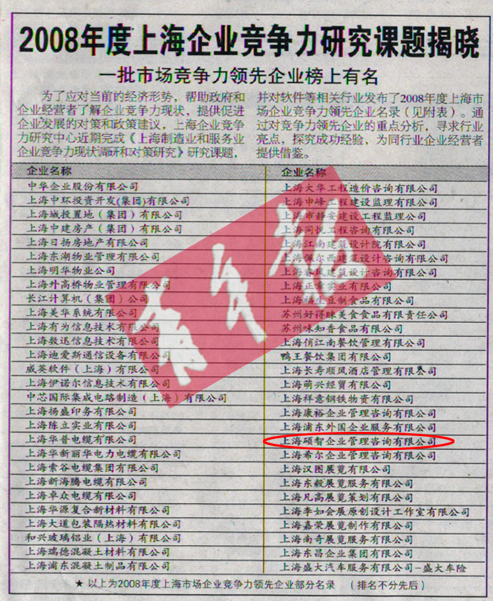 經(jīng)過市統(tǒng)計局、市經(jīng)濟信息委、市商務(wù)委指導(dǎo)和資料佐證,行業(yè)協(xié)會(商會)協(xié)助調(diào)研,且根據(jù)規(guī)模、市場、服務(wù)(產(chǎn)品)、管理、技術(shù)、文化、團隊、品牌、成長性、社會責(zé)任性等10項指對上海所有管理咨詢企業(yè)進行分析、評估。我公司被評入‘2008年度上海管理咨詢企業(yè)競爭力前50強’之行列。