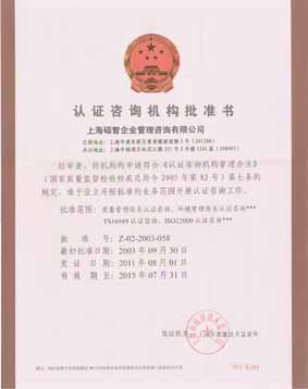 8月20日,公司得到正式批復(fù):此前向國家認(rèn)證認(rèn)可監(jiān)督管理委員會申報的認(rèn)證咨詢資格獲得批準(zhǔn)!批準(zhǔn)范圍為:質(zhì)量管理體系認(rèn)證咨詢(QMS);環(huán)境管理體系認(rèn)證咨詢(EMS);食品安全管理體系認(rèn)證咨詢(HACCP);汽車行業(yè)質(zhì)量體系認(rèn)證咨詢(TS16949);批準(zhǔn)證書號為:CNCA-Z-02Q-2003-058;有效期限至2011年8月19日。公司因此成為在華東地區(qū)認(rèn)證咨詢范圍最全的咨詢機構(gòu)之一!