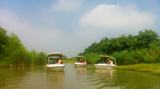 一進(jìn)入水中,涼風(fēng)習(xí)習(xí),大家興致瞬間全起,沒(méi)聽(tīng)裁判指令就爭(zhēng)先開(kāi)動(dòng)起來(lái)。兩岸蘆葦叢生,更有蜻蜓盤(pán)旋水面,風(fēng)景甚是美麗。由于水面水草漂浮,處于領(lǐng)先位置的船隊(duì)義不容辭的充當(dāng)起了斬水草先鋒,以己之船為大家開(kāi)路。同時(shí),更有救援小組,充分發(fā)揮舍己救人精神,幾次差點(diǎn)掉入水中,成功拯救其余陷入水草的船只。